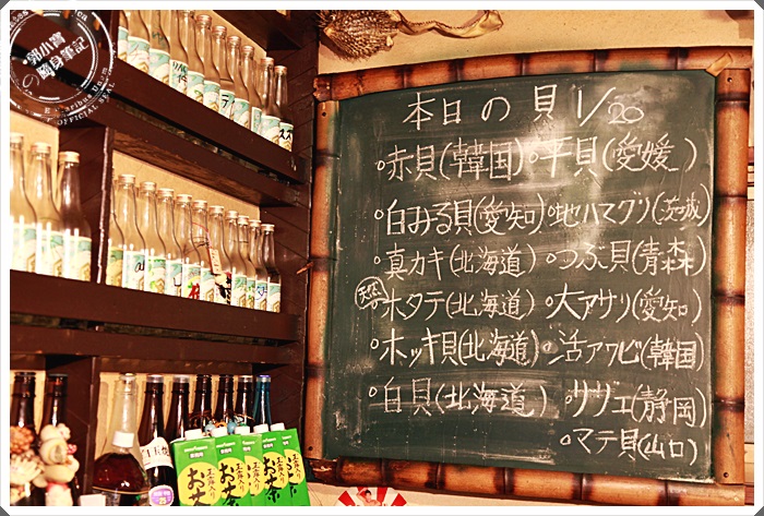 | 一旁的黑板上寫著今天的有甚麼貝,每天都換菜單,只挑選當季盛產的貝類,所以每次吃的都不一樣,每一種被後面都會著明是哪個地區生產的新鮮貝類,每天都有著日本各地的貝類。 |