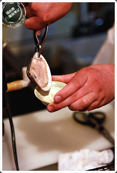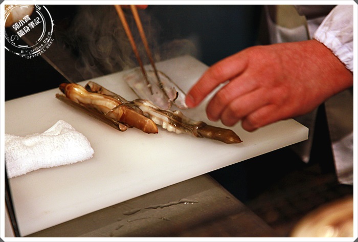 | 師傅熟練的將象貝解殼,取出裡面的殼肉,象貝解殼的過程汁流下好多水份,不知道刀子一劃開會不會噴一堆水出來,感覺好像沒甚麼肉的樣子。 |