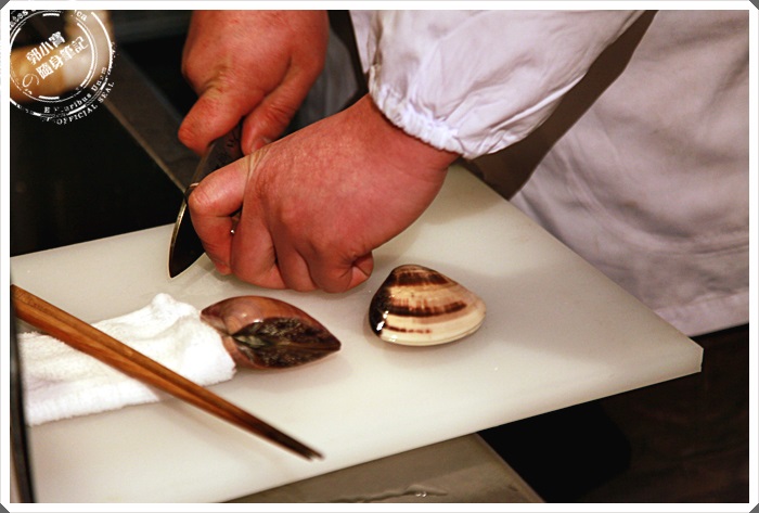 | 等我們開始吃竹蛤的時候,師傅又開始處理第二項貝類了,先將貝類的後端切掉,老實說我也不知道切掉什麼。 |