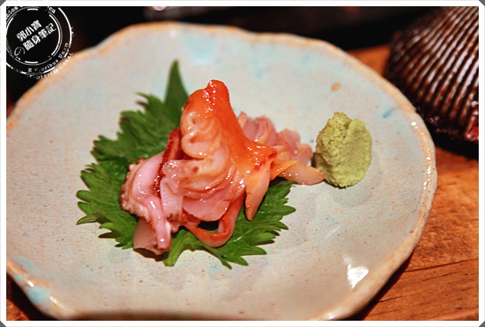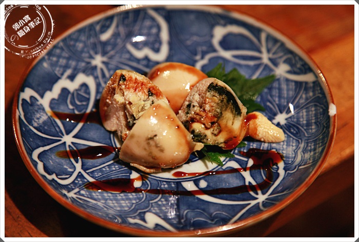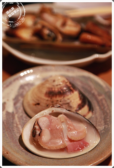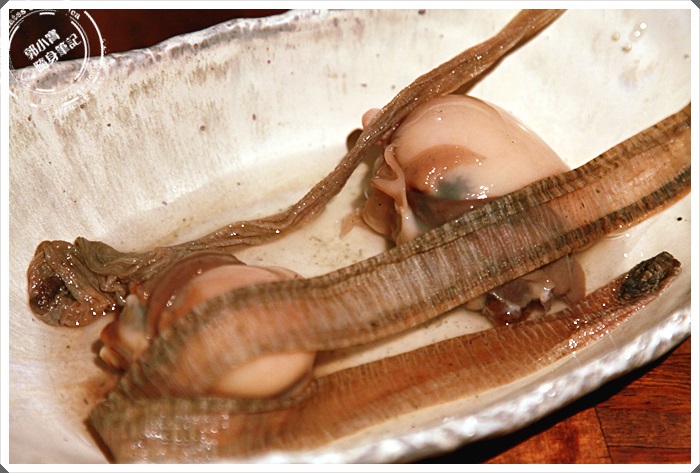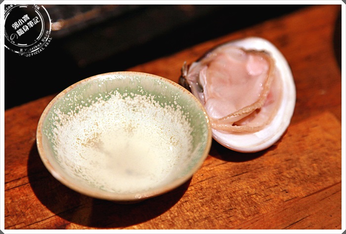 | 師傅把象貝的兩個部分分成了兩道料理,一個是用水燙過的肉,還有內臟的部分切半淋醬,這兩種吃起來都讓我相當的驚訝,老實說貝類的內臟我一直都覺得怎弄都會有很重的腥味,可是這樣用水稍微燙過吃起來卻是相當的美味,而且口感也不會很噁爛,真的好厲害,果然是貝料理的專門師傅,難怪這兩年會漸漸嶄露頭角再東京成為超難預約名店。 |