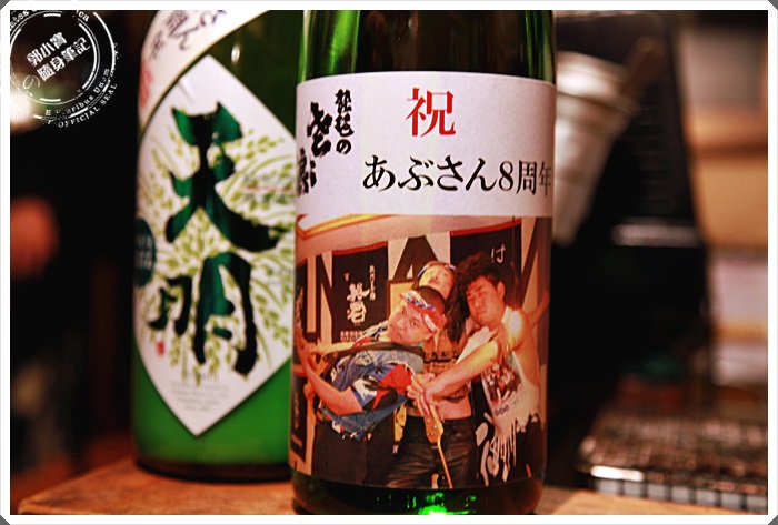 | 為了要好好的吃吃喝喝這一頓,我們還瞄準了這一瓶店家珍藏的清酒,這一瓶是為了慶祝八周年特別請會津的釀酒廠做的,店內保存的也不多,特別的是還是生菌的清酒,也就是打開會整個大爆炸的意思!!! |