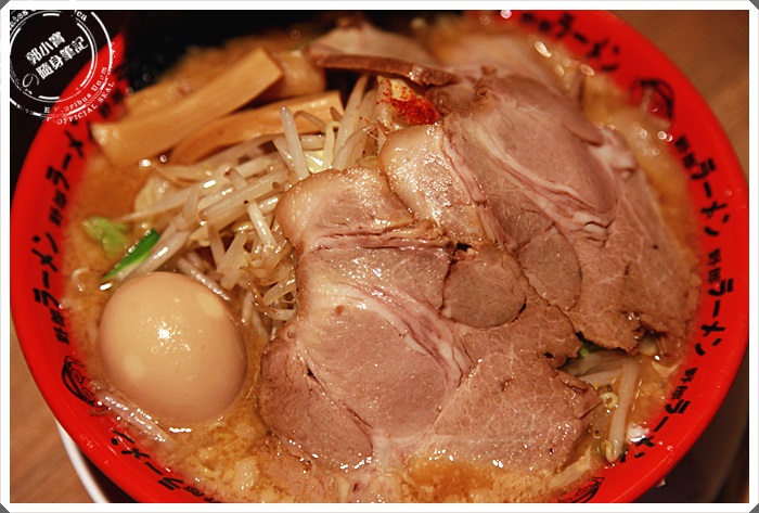 這一碗上來的時候更讓人有震撼感,大紅色的碗裡面裝著大份量的拉麵,從側面看真的堆疊的相當的高,叉燒的部分則是給了三片,這一碗主要走的是味噌湯頭。