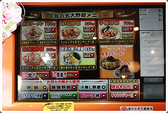野郎拉麵店同樣也是使用票卷機先購票的方式,但是它們家的購票機更方便,因為整台都是全銀幕觸控式的,附上精美的照片對身為外國人的我來說,挑選餐點可以更方便。