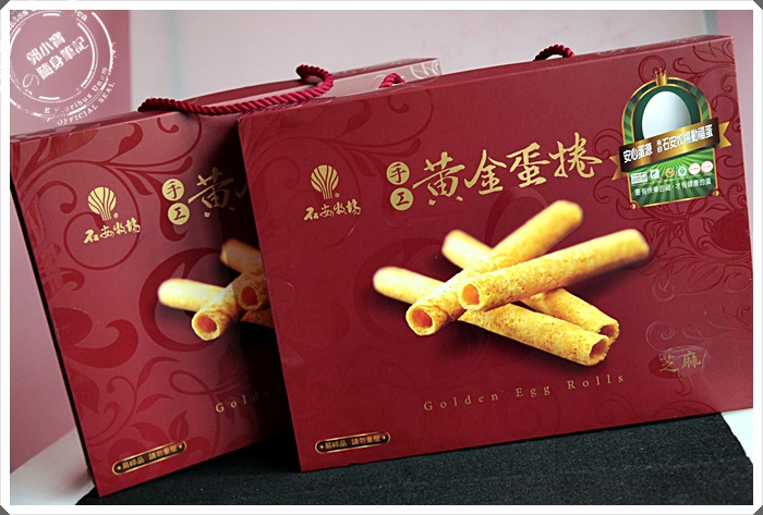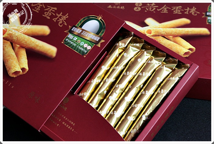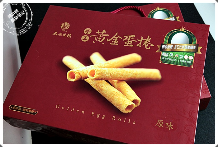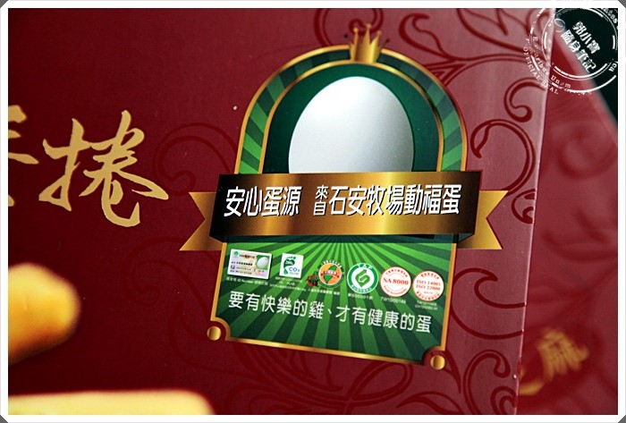 | 盒子上還有石安牧場的安心標章,有快樂的雞才有快樂的蛋,這一句話是石安牧場的座右銘,用快樂的蛋製作出來的黃金蛋捲,每一根入口都能讓人感覺到快樂。 |