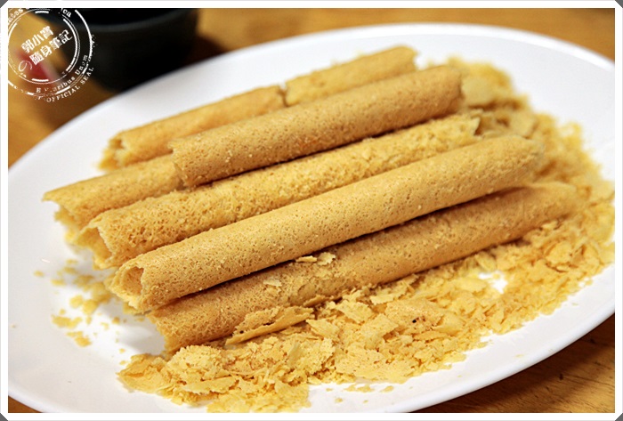 | 石安牧場的做的手工蛋捲保證不加一滴水,所以可以看到蛋捲皮上有相當多的氣孔,且石安牧場的蛋捲相當的易碎,把全部蛋捲拿出來拍照的時候幾乎整個房間內都是蛋捲的香氣,讓人忍不住一根一根接著往嘴裡塞。 |