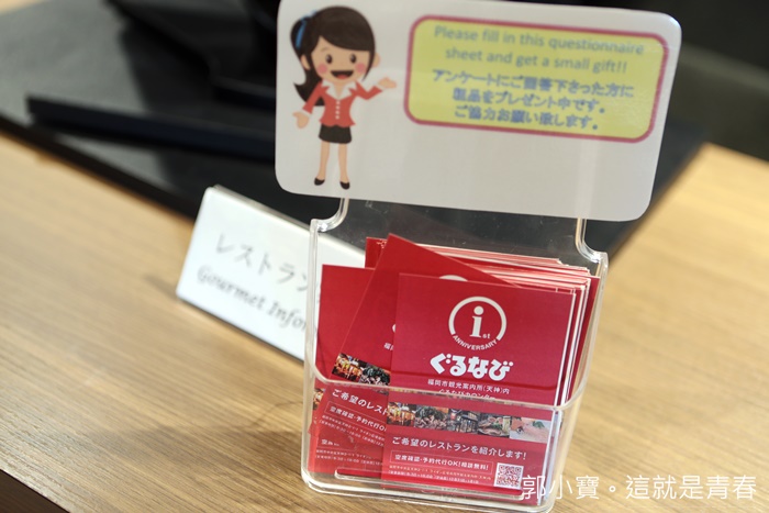 | 觀光案內所的服務櫃檯其中一個就是ぐるなびGURUNAVI的餐廳訂位櫃台,服務台內基本都會有英文溝通人員,大部分時間也都會有中文人員,如果妳來福岡不知道怎麼跟餐廳訂位的話,也可以直接尋找它們幫妳訂位,重點幫妳打電話訂位及提供相關服務都是免費的! |