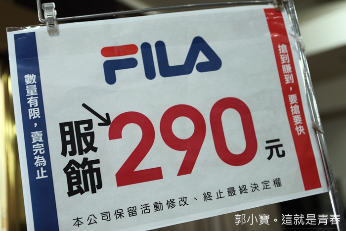 FILA服務全面290元也是買到賺到的區域,比較容易流汗的朋友可以跟我一樣,趁特賣會的時候多買個幾件,不然夏天真的很容易全身就濕透了,我就是很勤換衣服的那種XD