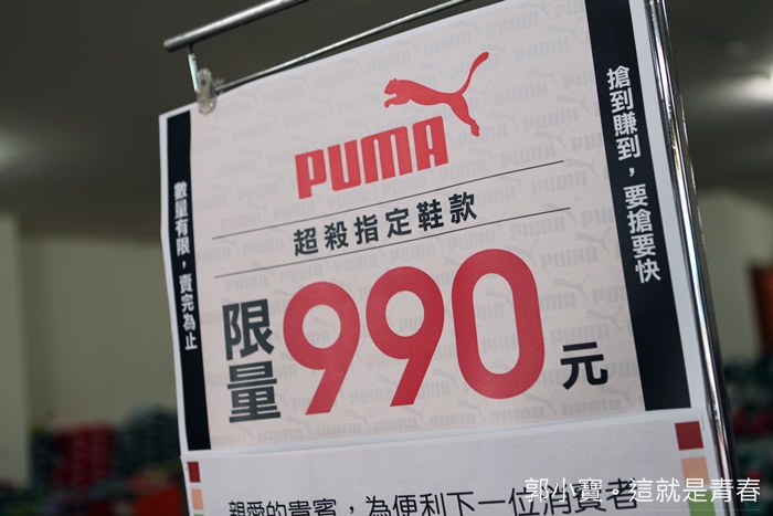 990專區大部分都是PUMA的鞋款,NB只有推出三款做990元,所以要搶的朋友真的手腳要快一點,雖然廠商有說會不間斷地持續補貨,但我個人認為總還是會有斷貨的時候,可能會換上不一樣的款式替補,每次過了一兩個禮拜,現場的鞋款很多都會不一樣了,因為94俗特賣會除了真的很敢放價錢,重點是鞋款又好看這才是最重要的XDDDDDDDDDDD |