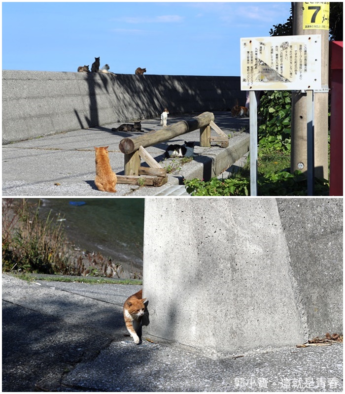 | 海岸邊的防坡堤上就看到一群貓慵懶地在那邊曬太陽吹海風,深島的天氣真的很舒服。 |