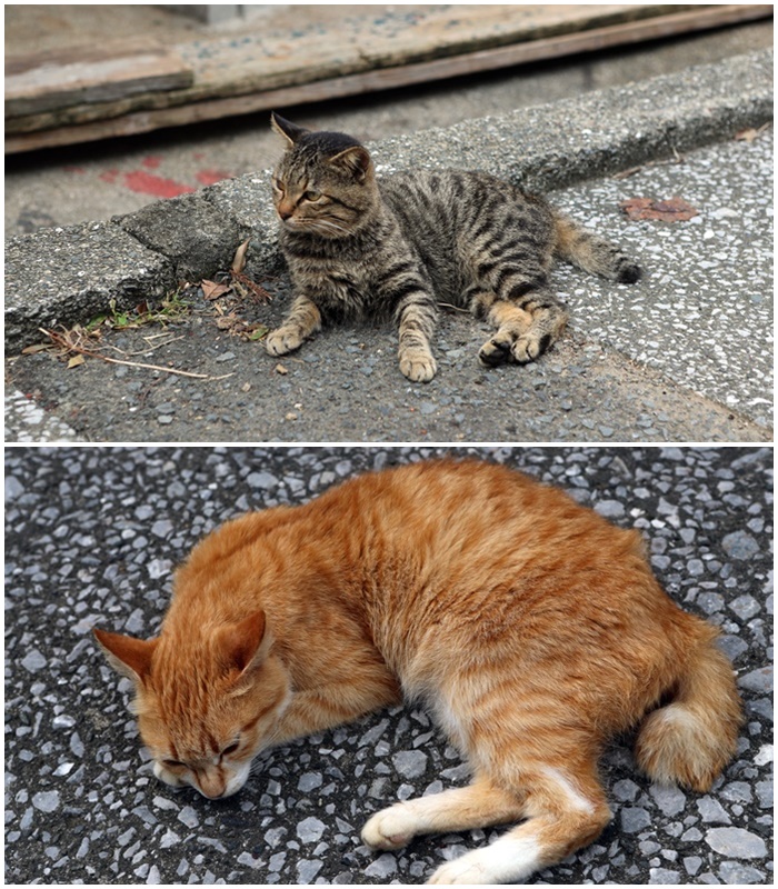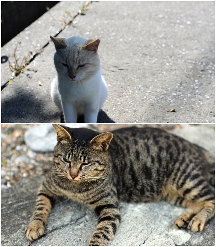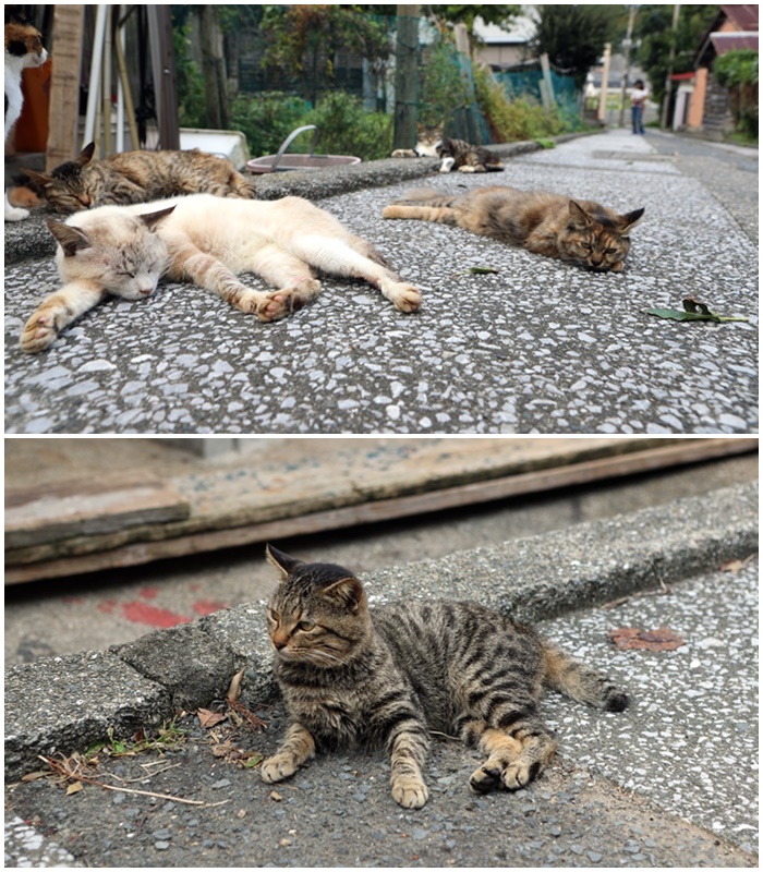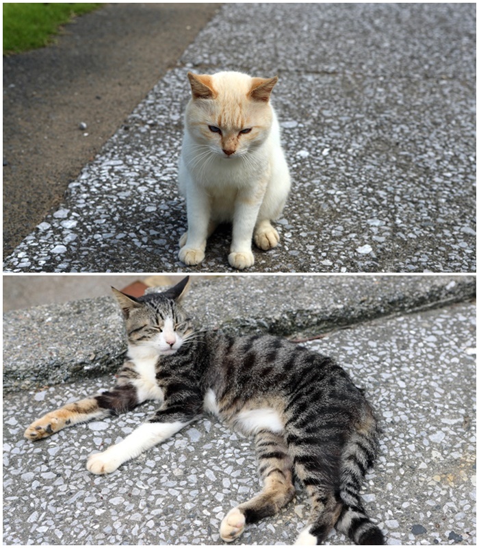 | 一點都不怕生的貓兒真的太療癒,也不管遊客行走路線,就這樣大辣大的躺在馬路上曬太陽,也不會去翻動遊客的背包,且每一隻幾乎都好健康,毛髮根毛色也都整理得很好,不知道的人還都會以為是家貓,殊不知這些貓都是沒有主人的,應該在深島過得很爽導致XD |