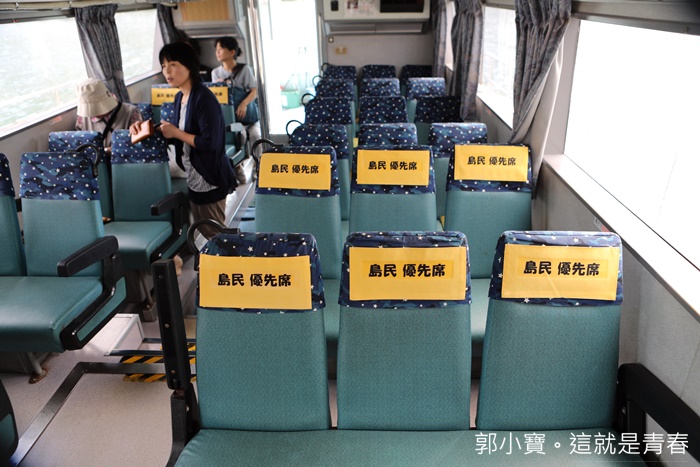 | 船內空間大約20個位子左右,有一些位子是專屬島民的座位,沒有島民坐的話遊客才可以坐,記得先禮讓島民,因為島民養這些貓不是因為觀光人潮,千萬別造成島民的困擾,當天乘船的時候座位還滿空的,所以不用擔心沒有位子。 |