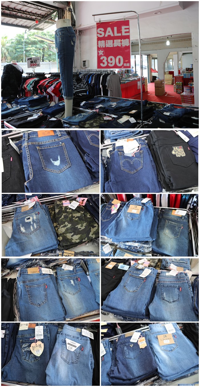 | 女的部分也是超多花車,且女生的版型也都很優,抓破的地方也都是很經典的刷洞,很多淺色系刷白的顏色都很美,都是現在市面上比較流行的款式,很多女生朋友喜歡的七分褲也有準備滿多貨讓女性朋友選擇,深色系的牛仔褲也不少!! |