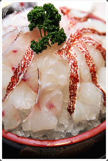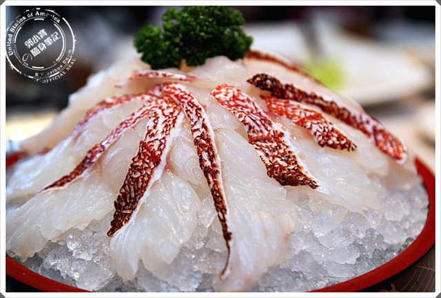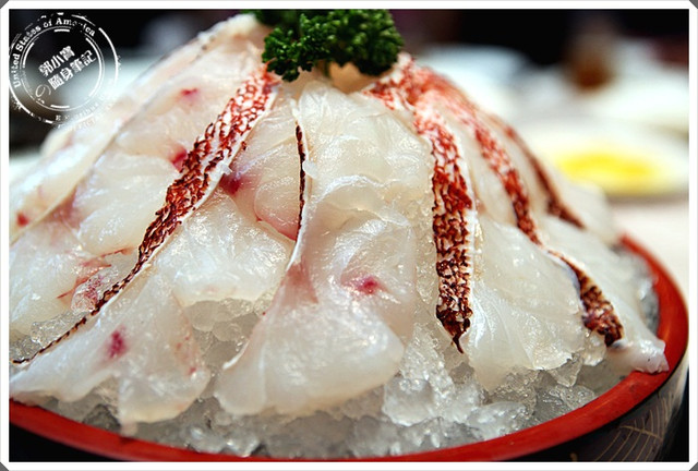 新鮮的石斑將魚肉片成條片狀,鋪在冰塊上面,光是視覺上就搶了很大的分數,
