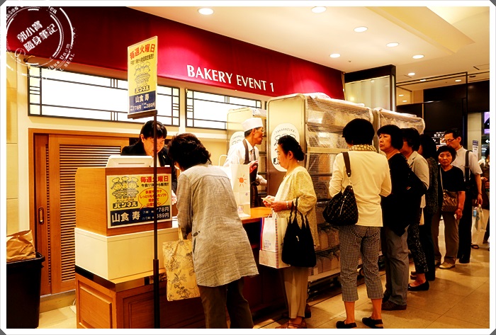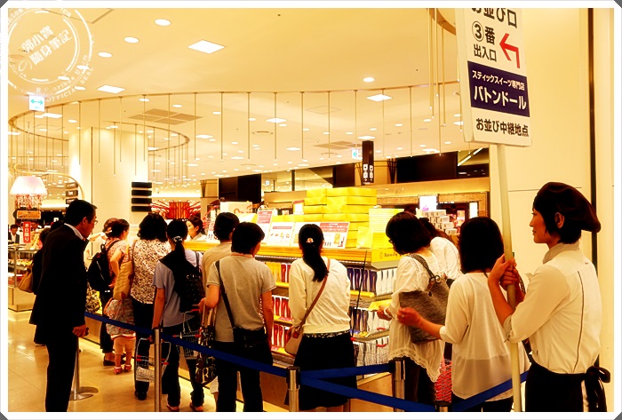 | 第一名排隊店 Bâton D'or バトンドール 一進門就可以看到大排的隊伍,甚至店內排到怕影響動向規劃,沿伸到另一側的電梯廣場旁排,這號稱LV等級的百吉棒幾乎是我每次來都要排的商品,平均排隊時間在2個小時左右,只要前面挑選的客人速度快一點的話,平均一個半小時就可以入手,目前在大阪的話只有高島屋跟阪急總店有專櫃,如果只是要單買Bâton D'or バトンドール的話,那可以在難波站高島屋那邊排隊即可。