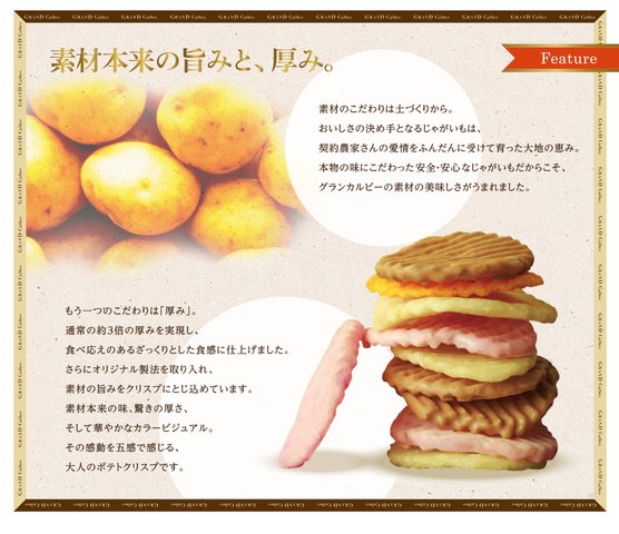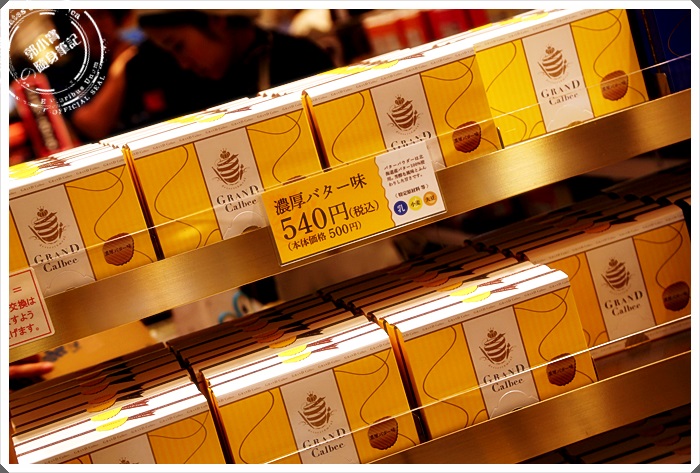 | 接下來要分享的排隊搶購第二波名單,這家GRAND Calbee是這一年才引起的風潮,之前幾年來阪急都沒看到它的蹤影,2014年這一年來就發現它了,排隊搶購的瘋狂一點都不輸給Bâton D'or,所以當然被我們鎖定目標列為要入手之一。 依照慣例還是先跟大家分享一下它的口味,字體顏色與外包裝顏色相同。