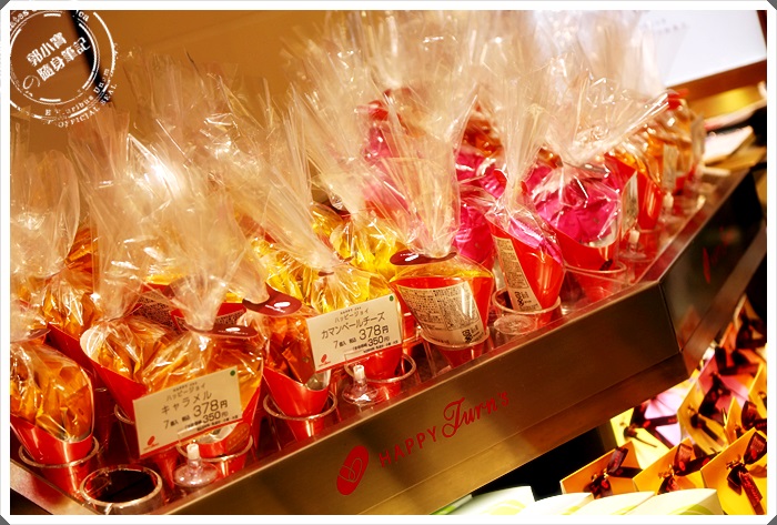 | 算是排隊名店中排隊時間最少的,大概平均15分鐘內就可以排到了,但是排隊的人也超級多,一直都是人來人往的,HAPPY Turn's|亀田製菓株式会社算是成功把米菓重新包裝推向高價的推手,地下一樓的甜點街其實分成兩邊,一邊是蛋糕跟餅乾,一邊是日式和菓子,但是人潮幾乎都在蛋糕跟餅乾這一區,唯一一家在日式和菓子裡面有人潮又大排長龍的就只有這一家了,但是回家吃過一次後就明白為什麼會那麼受人歡迎,HAPPY Turn's的包裝有很多種口味也相當的多,包裝盒從獨立口味到綜合口味通通都有,大包裝小包裝也都有,非常的貼心。 |  |