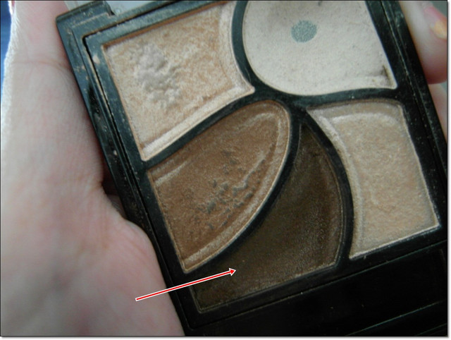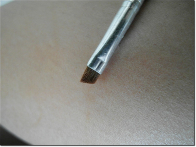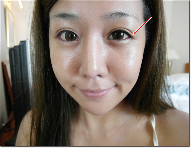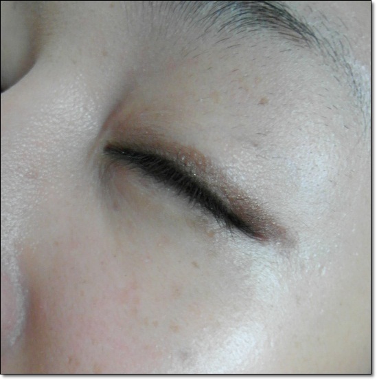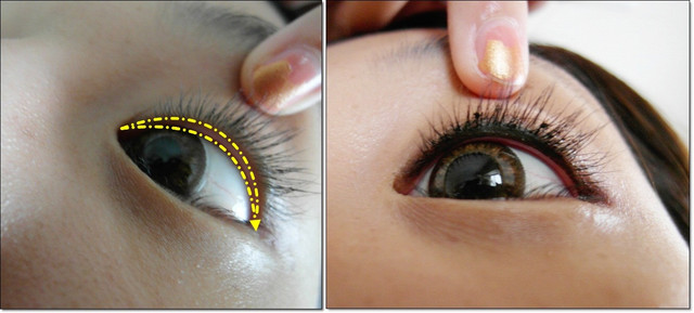 接下來我要用一點點咖啡色的眼影,取代眼線就可以了,然後眼妝要乾淨,所以我連打底都不要了拿起斜角刷具,有看到圖片左邊嗎?? 就從眼頭前面慢慢地刷到後面來,這個很簡單的按造自己的眼睛輪廓 畫個 C的意思啦, 但別忘記喔 下手都要輕輕的淡淡的喔!!!