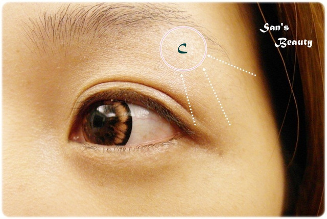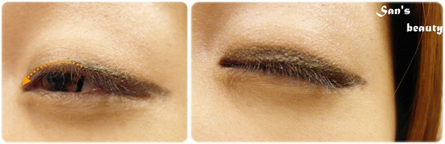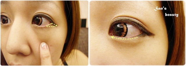 這樣子才能讓整個眼睛有拉長的效果,再來再使用帶點珠光的亮膚色的A