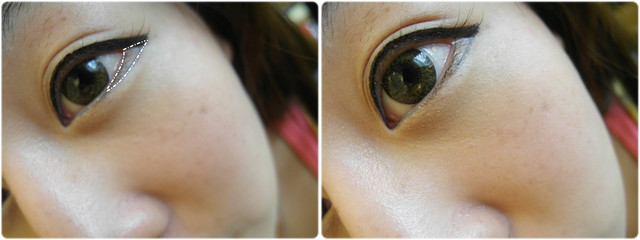 就像這樣子,不用擔心填滿會妝感很重,其實不會的,但就只需要在眼中後的到三角部分就好