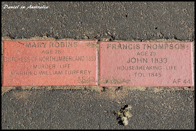 | 在Campell Town鎮的另一個小特色就是在路旁的人行道的紅磚上暗藏玄機,紅磚上寫的是罪犯的犯罪紀錄,包括年紀、犯罪行為等,都清楚得刻畫在紅磚上,我想應該是塔斯馬尼亞曾經是用來關著罪犯的地方,還有部分監獄的遺址座落在此島,有沒在這小鎮我不清楚,但我知道Ross小鎮附近有有個監獄遺址,這特色雖不明顯,但是來到的話倒是可以瞧一瞧, |