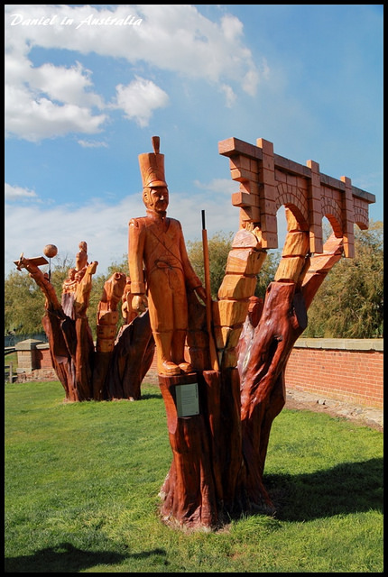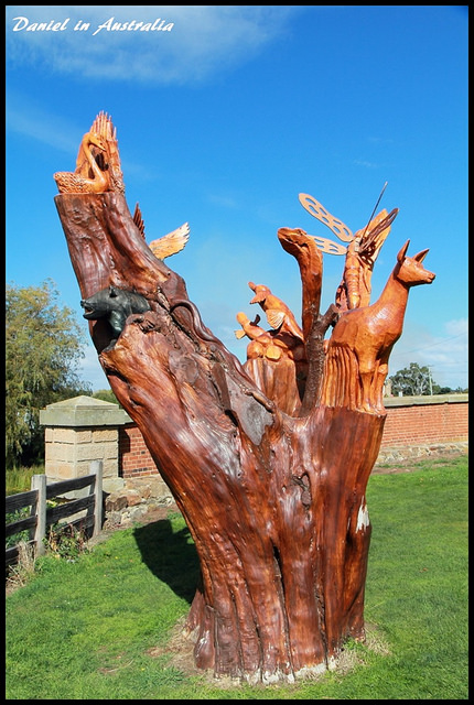 | Campell Town也是木材的生產地,而在磚橋旁的空地則有著三座藝術家用當地木材創作的木雕,在木材的末端雕刻上栩栩如生的元素,動物、人物以及城牆等,讓這座歷史小鎮多了些藝術的氣息,也凸顯了這小鎮的特色, |