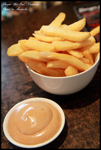 | 薯條,雖然漢堡的份量就已經夠多了,但我跟朋友還是想嘗試Burger Got Soul的薯條,所以就點來吃看看,而薯條的份量給的還不少,炸的香氣四溢口感十分酥脆,而搭配薯條的沾醬也有好幾種可以選擇,我忘了我選的是甚麼口味了,但是這沾醬非常特別,是我前所未見,讓薯條有更多不同的風味, |