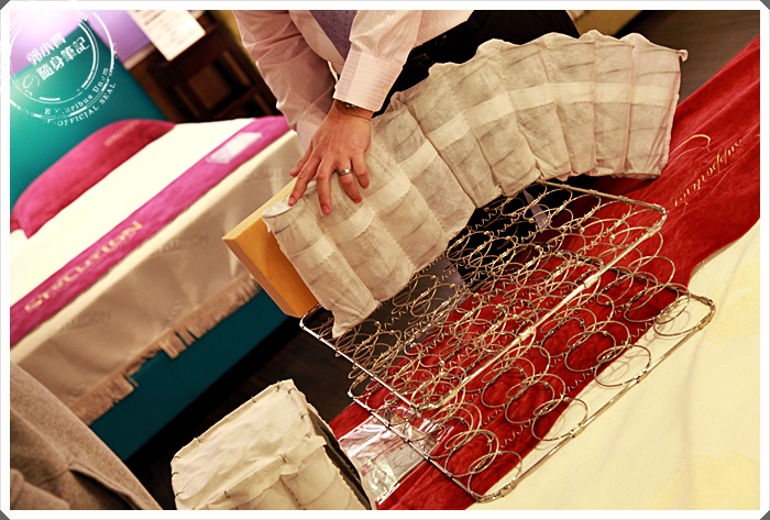 | 因為事前在網路做了一些功課,但是總是從字面上了解獨立筒的意思還是不夠完整,趁著來到蕾絲床墊專賣門市就直接問了一下裡面的人員,瞬間就看到很多道具出現了,講解相當的細心,也讓我了解了很多有關於獨立筒的優點,簡單來說獨立筒的原理是以多個的獨立彈簧(每張床墊都有各自尺寸的彈簧),每一個彈簧都以不織布做的彈簧套包覆著,再一個一個縫在一起去形成床的結構體。