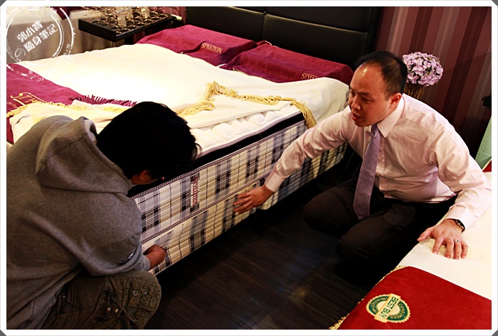 | 講解的相當清楚的專業人員,因為我一直好奇我的新床墊是要買床架還是下墊,基本上他們還是建議我買下墊,除了可以保護上墊的彈簧以外,重點在這邊的規格都是設計好的,是最符合人體工學的45公分高度,坐在床緣剛好雙腳可以著地支撐,下墊的角柱是可以調整高度的,這倒是讓我猶豫很久,因為很多寢具都是包覆式的,都會露出下墊很明顯的一截,但是幾經思考後還是決定上下墊一次買一買。 |