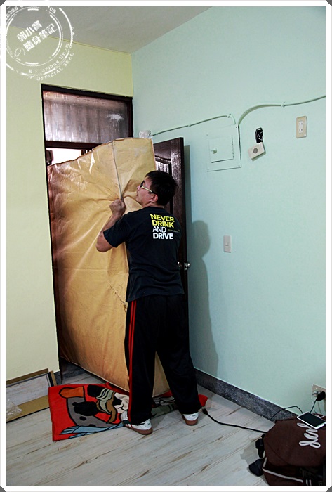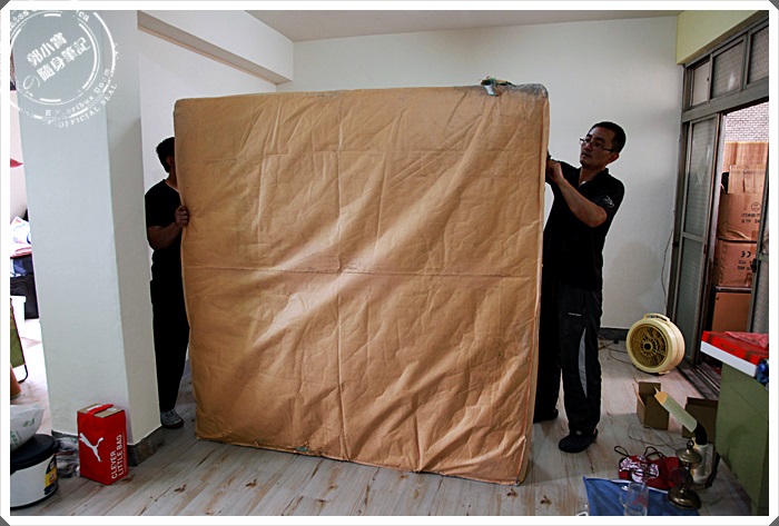 | 運送組裝人員小心翼翼的將床墊扛到四樓,板橋這邊其實是一間老公寓,樓梯的轉角跟高度都很小,真難為她們可以毫髮無傷的運送上來,外層來包了一層厚厚的牛皮紙袋保護著。 |