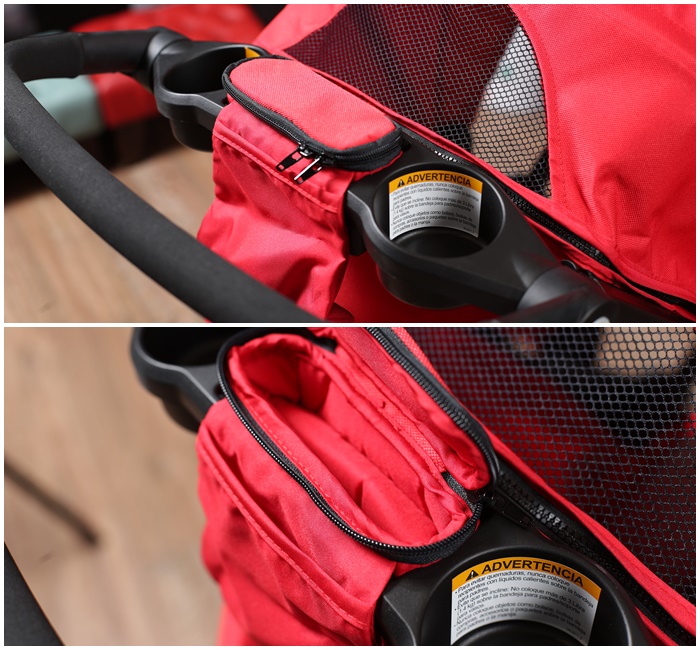 推車握把外層還有海綿包裹,同樣減緩手掌跟虎口的摩擦力,推車握把連接著後置物盤還有一體成型的收納袋,後置物盤有兩個杯架方便媽咪放些保溫水壺或是零錢跟小東西,外出奶粉罐大小也剛剛好。