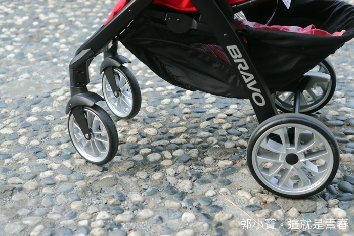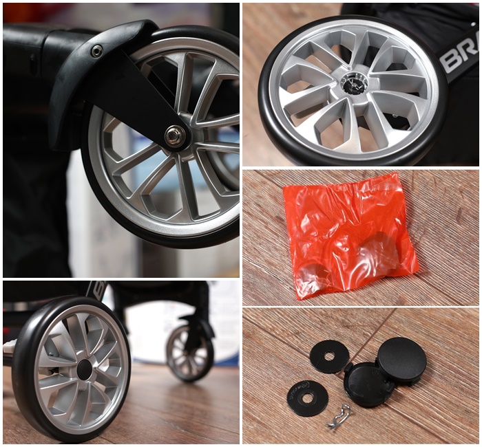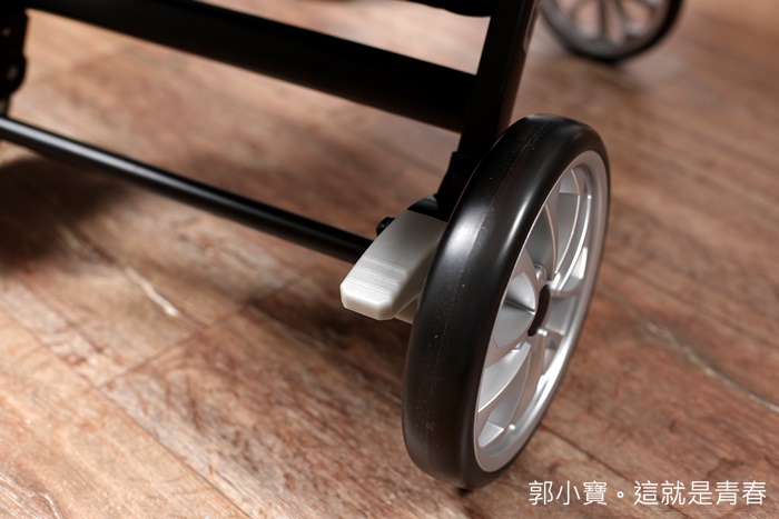 | 輪子的組裝也很簡單,我喜歡Chicco Bravo的大輪框,推起來會更輕鬆也可以輕鬆面對很多高低不平的路面或是小台階,組裝輪子比較需要注意的地方就是後輪的部分,裝上後輪的時候需要放上墊片後再扣上鉚釘針才可以讓輪子穩定的在支架上,前輪的部分只需要把輪子按壓插入洞內聽到喀擦一聲即可。 |