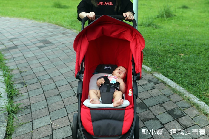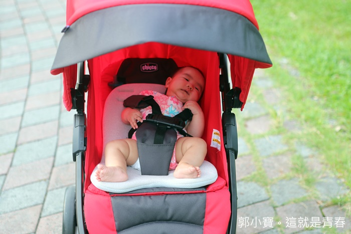 | 看看我們家Cola一臉爽爽的臉就知道了,推著推著就睡著了,加上Chicco家的推車布料真的我有比較過,摸起來質感好了許多,非常舒服的布料。 |