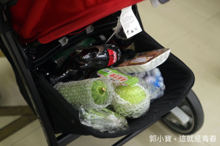 | 底下的置物籃真的可以放超多東西的,這一天我大概買了數十瓶可樂還有雞肉、蔬菜、醬油等等的生活用品,滿滿的一大籃裝的超滿,重點回家的路上推起來依然非常順手,一樣非常好推。 |