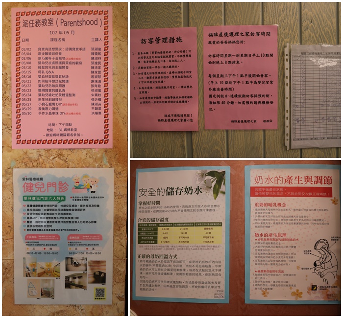 | 福臨產後護理之家的規矩真的非常多,貼滿了裡裡外外每個房門跟走廊一直提醒妳遵守規定,因為畢竟這一棟裡面都是很怕感染細菌的產後媽媽跟新生兒,所以我還滿能接受他們這樣的龜毛,即使不方便,但是都是為了保障每一個人,另外對於我們很有幫助的就是媽媽教室,把一整個月的時間表都列出來,我們是新手爸媽,所以很多關於新生兒的知識真的不多,這一部分真的教我們滿多的。 |