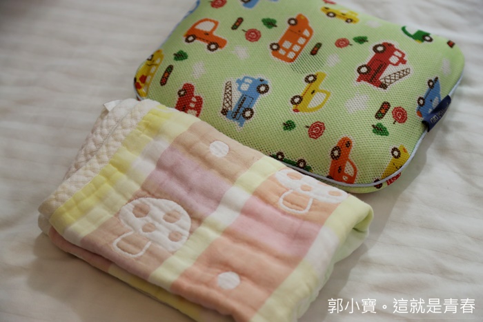 | 給寶貝蓋的是超夯的日本Hoppetta六層紗蘑菇被跟同樣很夯的韓國Gio新生兒枕頭,聽說是專門顧頭型的枕頭。 |