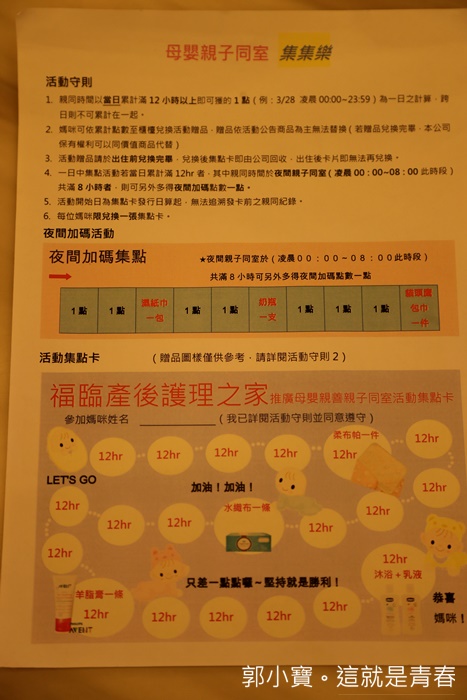 | 後來才發現,原來為了鼓勵母嬰同室,福臨產後護理之家還有推出集點活動,只要入住期間母嬰同室的時間達到標準都會贈送點數,可以換到的獎品超豐富的,我看好多媽媽的推車底下都快塞滿了獎品,但是我們家的好像一直都很空,幾乎大部分都給嬰兒室的護理人員照顧,反正來月子中心就要盡情地享受最後的優閒時光XDDD |