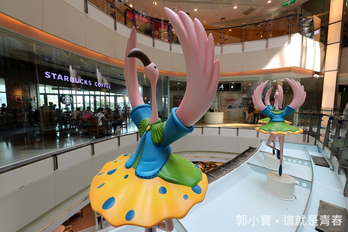 | 一旁還有會開心轉圈圈的紅鶴小姐,真的好可愛,如果搭配典音樂的話可能會更不錯唷,不過我覺得大江這次的主題真的很棒,大面積的迷幻森林感覺真的讓人消暑不少,購物商場的冷氣也滿涼的,就算是單純要來這邊走走吹吹冷氣也不會無聊,而且停車場又免費,難怪連平日都可以吸引很多人潮! |