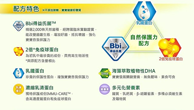 還有比較特別就是它還含有母乳中的乳鐵蛋白跟免疫球蛋白,這兩個來自母乳的成分都是讓寶寶可以延續母乳的保護力。