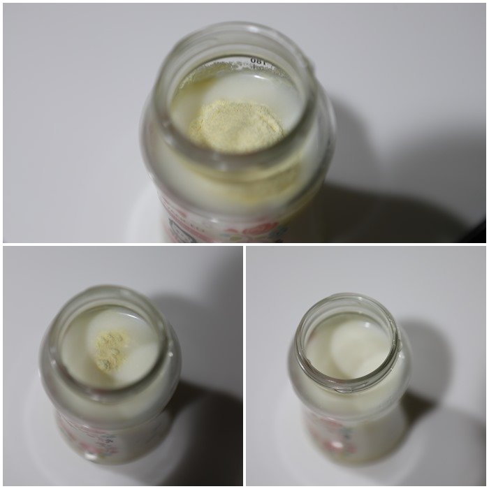 | 把奶粉倒進去其實沒搖晃也能慢慢地溶解在水中,因為奶粉非常細緻的關係且水溶性非常的好,一歲後我們一天只讓Cola喝早晚兩次,加上一次量少的睡前奶,靜置不到10秒就會消失了。 |