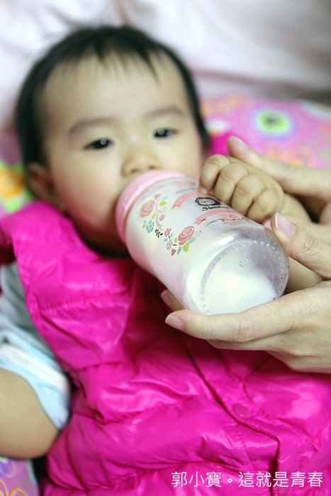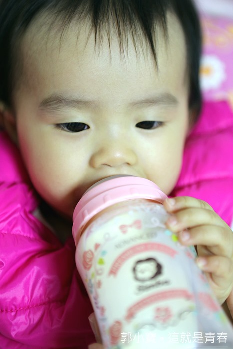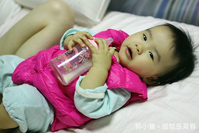 | 不管抱著喝、趴著喝、蹲著喝、躺著喝通通都沒問題的Cola,一整個就是一個撒嬌鬼,明明都可以自已拿奶瓶了就不願意拿,一定要爸爸還是媽媽餵她,但是沒關係,爸爸可以,只要妳願意乖乖的把這些好菌好營養通通喝下肚,爸爸通通都可以XDDDDD |