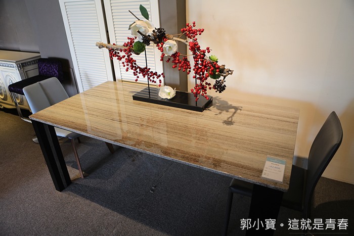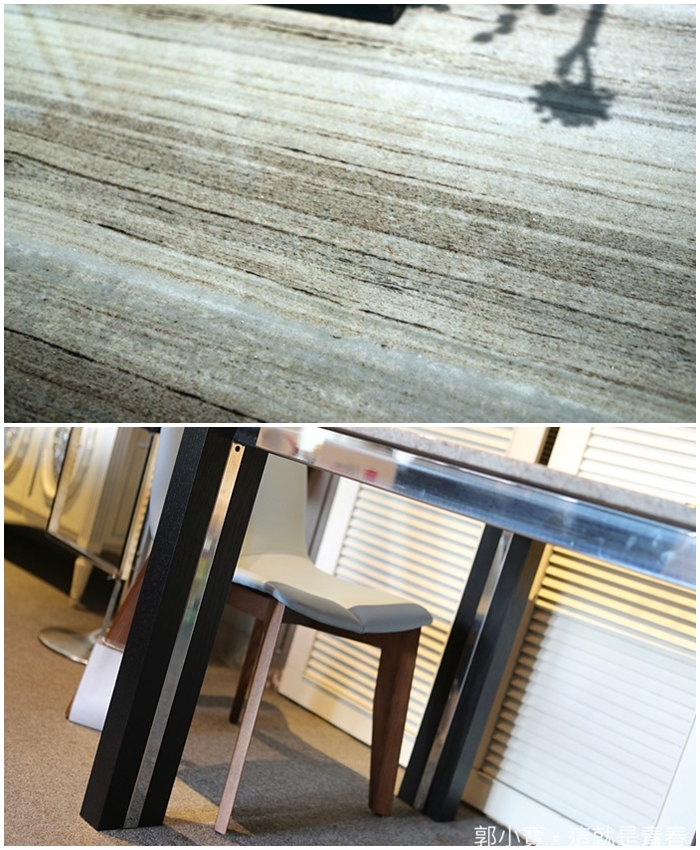 | 非常少見的木紋石也超美的,大理石桌面也是很多人買餐桌的選擇,而且大理石拋光後非常好整理又耐用,桌腳也滿有設計感,不同的桌腳方向造成的視覺感非常豐富。 |