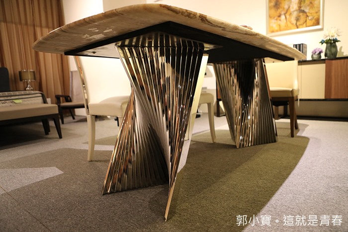 | 全部的餐桌我老婆看中的就是這一張,除了是她最愛大理石桌面以外,這張大理石的紋路剛好也是她喜歡的,還有我老婆最愛的就是她的桌腳,就閃亮亮的桌腳真的很耗時費工,是老師傅純手工一條一條焊接起來的,完全就是工藝的展現。 |