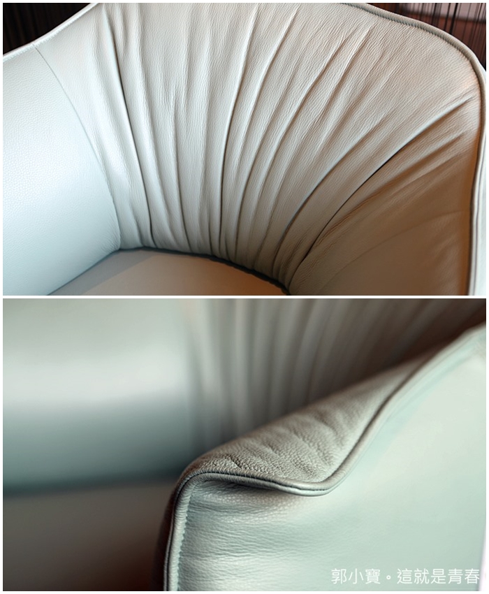 | 超可愛又好看的單人坐椅,我超想要搬一張回家的,全牛皮的質感加上抓皺的設計真的超美,還有可愛的反摺水餃長邊也很吸引人,坐上去整個人都被包覆起來超舒服的。 |