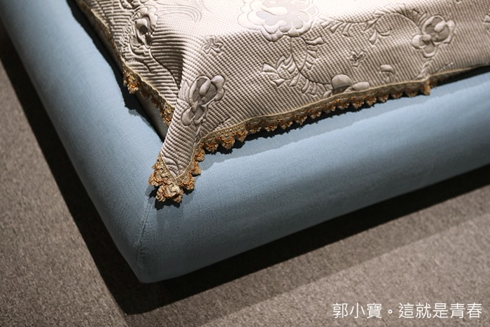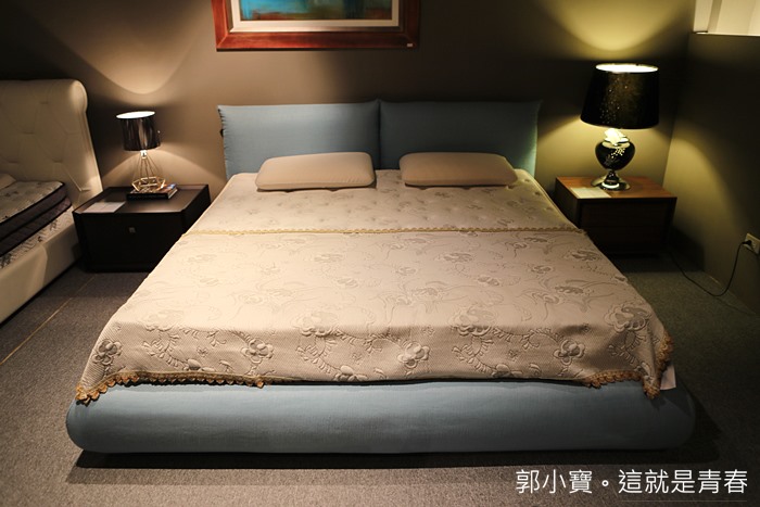 | 義式經典設計床架,水藍色的床架非常的美,邊角的部分有特別坐的圓潤一點,加上布料材質包裹著,所以有時候踢到也不會疼痛,加上床板一體成形的顏色非常柔和,彷彿躺在淡藍色的海洋上,床架的尺寸也可以特別訂做。 |