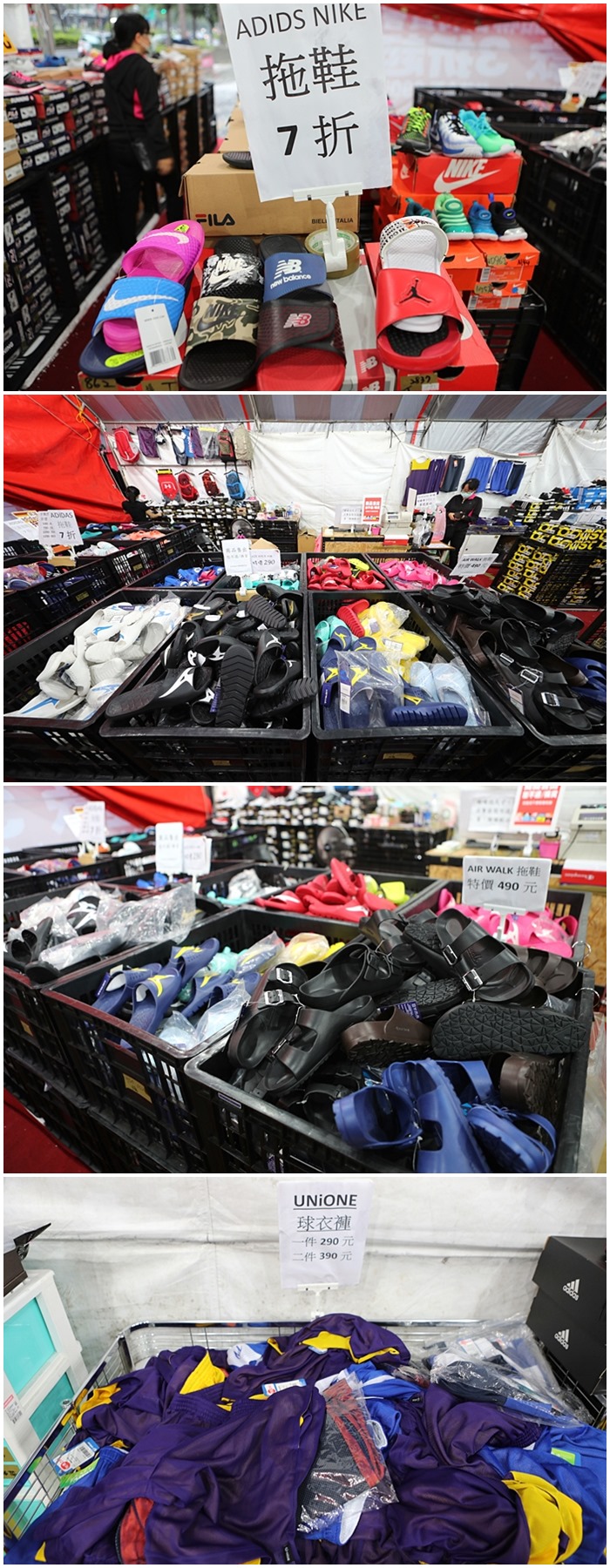 | 還有耐吉跟airwalk的拖鞋通通也都是折數下殺,除了拖鞋以外現場很多打球的人必搶的籃球衣褲超便宜的,幾乎有打球的人經過就一套一套的拿,這價位真的破天荒的出清價格!! |