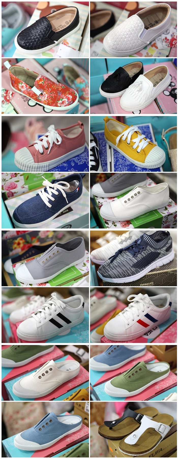 | 富發牌古著鞋真的很好買,從帆布鞋到布鞋還有很多女生喜歡的學生皮鞋通通都有,他們家的白布鞋還有今年超流行的小碎花元素,很多顏色也都是屬於女生喜歡的粉嫩款,而且它們家的鞋子很穿,台灣手工製作真的便宜又好穿!!! |