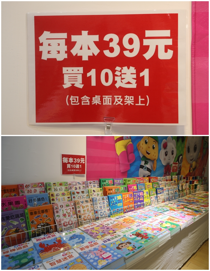 這一區真的超好買的,一本39元幾乎拿10本都不會手軟,除了有小朋友最愛的貼貼本以外還有著色本,著色本真的永遠都買不夠,小朋友的想像力較豐富,對顏色的敏感度也較高,小朋友大多都喜歡塗鴉,所以著色本的消耗是非常快的,可以藉由這一次的超低價多入手幾本,當然還有很多家長都需要的數字、國字練習本,迷宮書我也很推薦,對於小朋友來說都是一定要入手的書本!!!!