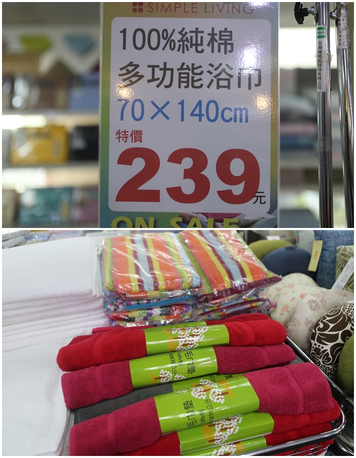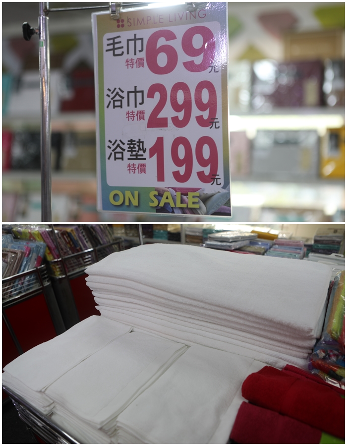 | 飯店等級的毛巾、浴巾、浴墊通通都是破盤價的大出清。 |