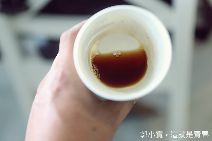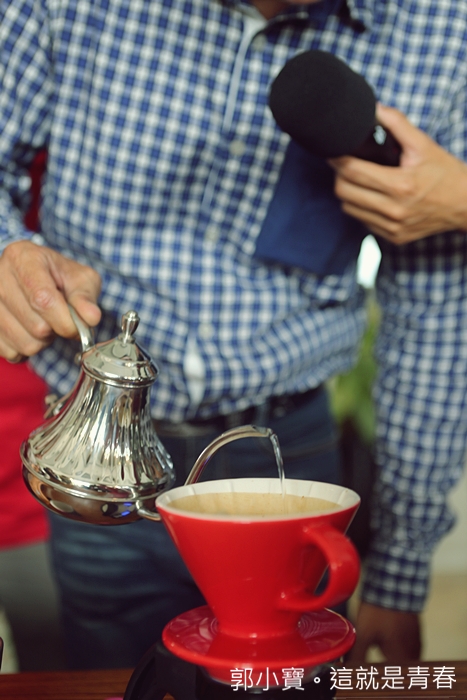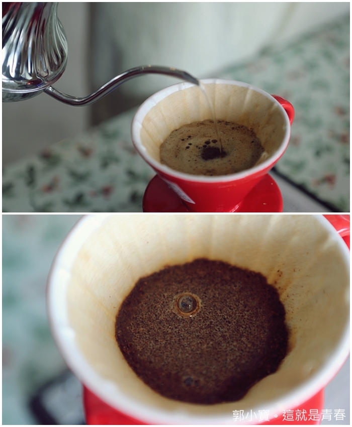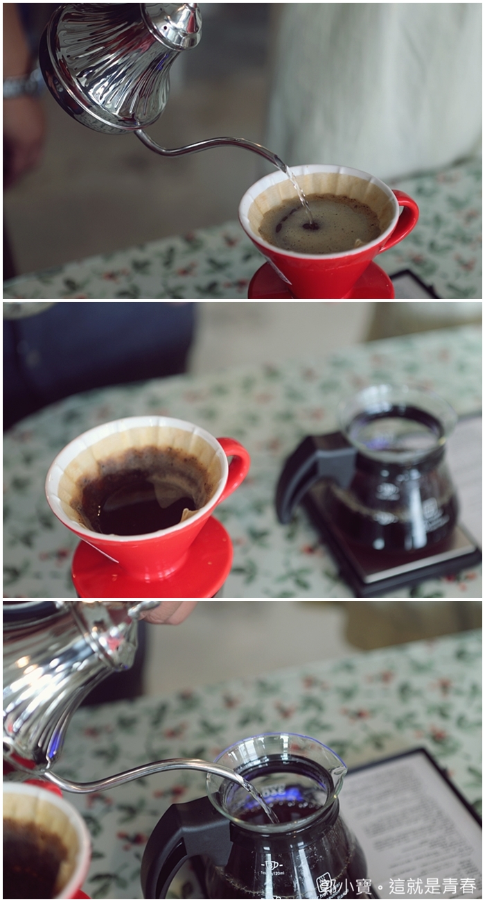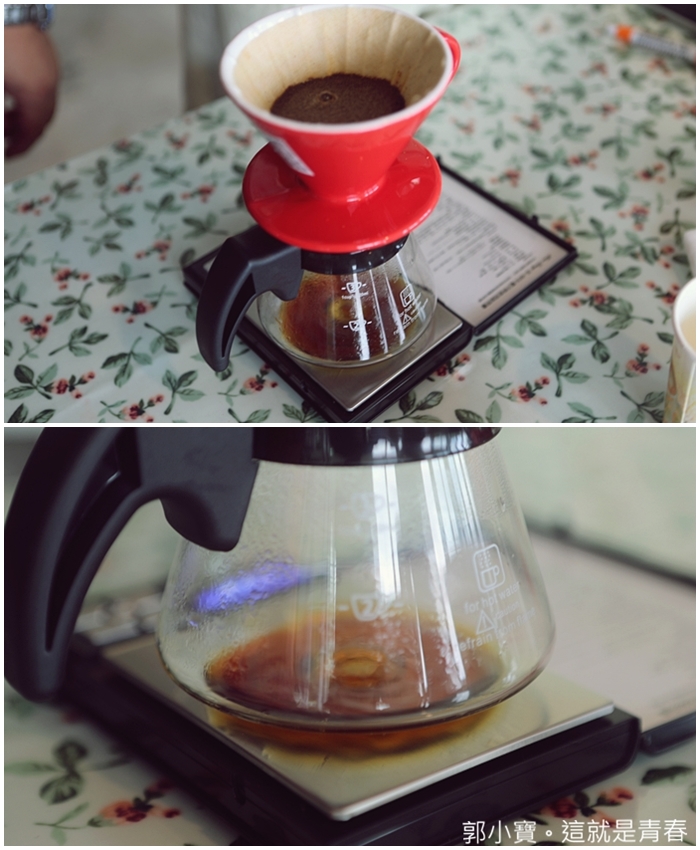 | 還有老師一直強調澆淋的時間千萬別超過兩分鐘,兩分鐘一到就一定要把濾壺拿掉,不夠的話直接用熱水補在咖啡壺裡面即可。 |
