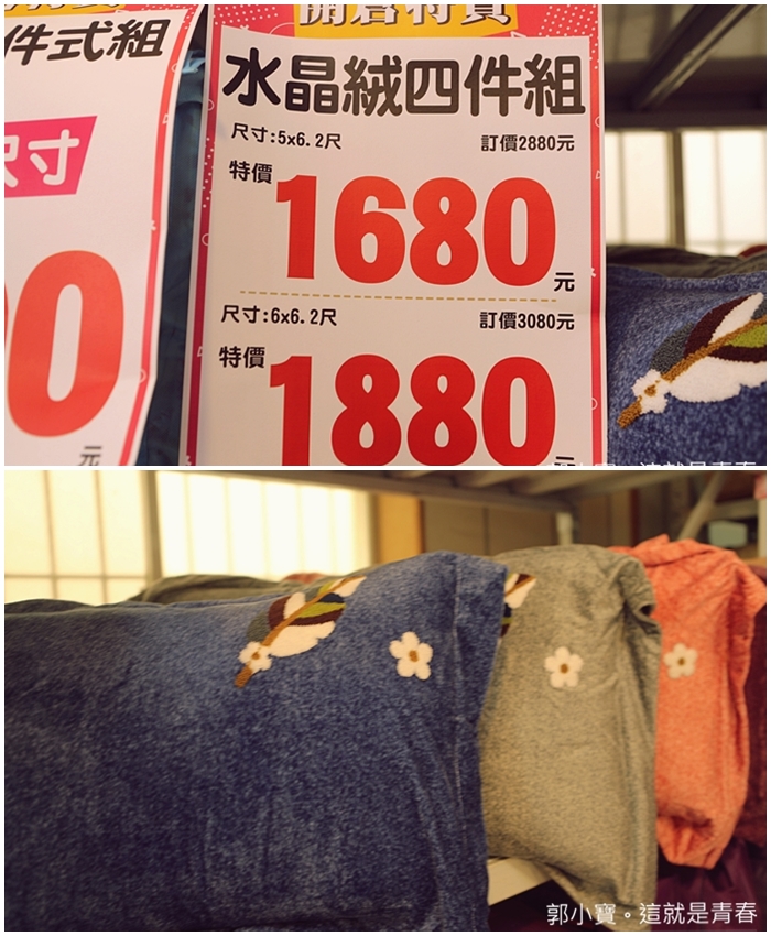 | 還有我老婆本身就很喜歡的水晶絨四件組也殺到了1680元,水晶絨的觸感本身就更細緻以外,還有立體刺繡針的超美的啦,我老婆只要每次到寢飾特賣會都會瘋狂採購,加上秋冬曬床單真的很慢,所以她都會準備好幾趟替換,針對不同的季節跟天氣來更換材質。 |